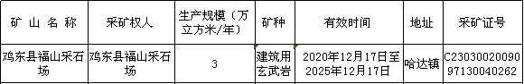 根据《中华人民共和国行政许可法》《中华人民共和国矿产资源法》《矿产资源开采登记管理办法》(国务院令第241号)《自然资源部关于进一步完善矿产资源勘查开采登记管理的通知》(自然资规〔2023〕4号)等相关要求,鸡东县福山采石场采矿许可证有效期限已于2025年12月17日到期,采矿权人未在规定期限内申请办理采矿许可证注销手续,采矿许可证自行废止。如存在应履行而未履行的义务,在矿业权注销后仍应履行。按照相关规定,现予以公告,公告期为2026年1月20日至2026年3月3日(30个工作日),公告期内如有异议,请以书面形式将意见反馈至鸡东县自然资源局。逾期视为无异议,我局将按程序予以注销采矿许可证。