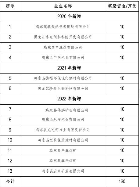 按照《鸡东县新增规模以上工业企业奖励资金实施细则》(鸡政办综[2023]2号)文件要求,对2020年以后(含2020年)主营业收入达到2000万元新纳入规模以上统计的工业企业,由县政府给予每户企业一次性奖励10万元。经各有关部门审核和认定,黑龙江珍爱生物科技有限公司等13户企业符合奖励条件(详见附件),特此公示。