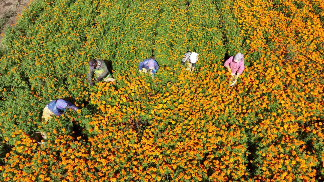 眼下,永和镇1300亩万寿菊种植基地已收获完毕。万寿菊为一年生草本植物,富含天然色素叶黄素,且抗病能力强、种植成本低。基地采用“7天一采”的高频采收模式,吸引了大量周边村民就近务工,工人每小时可获14元工钱,不少人单季能挣6000余元。种植户王成参与“公司+农户”模式,种有500多亩万寿菊,销售额超100万元。截至目前,全镇万寿菊累计采摘量达3000吨,直接带动周围农户200余人,农户总增收200余万元,农业技术人员还全程指导种植管理,企业订单更消除了农户后顾之忧。
